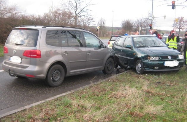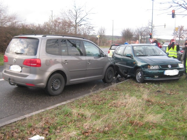 Am 10.02.16, gegen 16.05 Uhr, bog eine 18-jährige VW Fahrerin von der B 37 kommend nach links in die Kanalstraße ab. Nachdem der Abbiegevorgang bereits beendet war, kam sie aus bisher nicht geklärten Gründen auf die linke Fahrbahnseite, touchierte einen dort wartenden VW-Golf, der von einem 49-jährigen Mann geführt wurde, stieß anschließend seitlich gegen die Front eines VW Touran, an dessen Steuer ein 18-jähriger Mann saß und kam danach im Grünstreifen zum Stehen. Die 18-Jährige konnte sich ihr Fahrverhalten nicht erklären. Alle Beteiligten blieben unverletzt. Der entstandene Gesamtschaden beläuft sich auf ca. 5.500,- Euro.