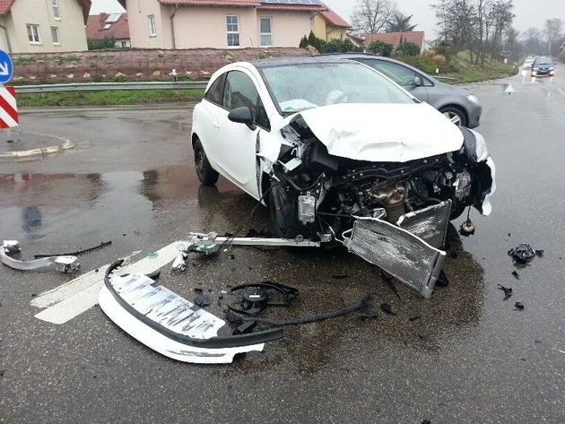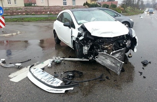 (Bad Dürkheim) - Verkehrsunfall mit Verletzten und hohen Sachschaden Am Samstag, 13.02.2016, kam es um 15:20 Uhr, zum Zusammenstoß eines Pkw mit einem Kleintransporter. Die 26-jährige Fahrerin eines Opel Corsa aus Erpolzheim befuhr die L 526 aus Erpolzheim in Richtung Feuerbergkreuzung. Hier wollte sie nach links abbiegen, missachtete nach bisherigen Ermittlungen jedoch die Vorfahrt des von links kommenden Kleintransporters. Der 58-jährige Fahrer des Iveco aus Frankenthal konnte einen Zusammenstoß nicht mehr vermeiden. Nach bisherigem Erkenntnisstand wurde der Fahrer des Kleintransporters leicht an der Hand verletzt. Er wurde zur ärztlichen Versorgung ins Krankenhaus nach Frankenthal gebracht. Die Fahrerin des Opels und ihr Beifahrer wurden vorsorglich ins Klinikum nach Ludwigshafen verbracht. Beide Fahrzeuge wurden erheblich beschädigt, geschätzter Gesamtschaden ca. 20.000,- Euro. Der Opel dürfte einen Totalschaden erlitten haben. Beide Fahrzeuge mussten angeschleppt werden. Für die Dauer der Unfallaufnahme und des Abschleppvorgangs musste die Polizei an der Kreuzung den Verkehr regeln.