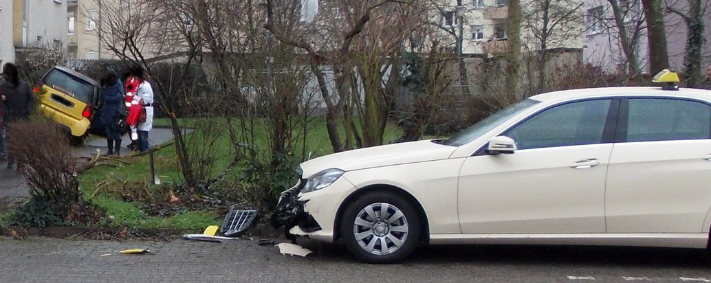 Gestern gegen 15.30 Uhr kam es zu einem nicht alltäglichen Unfall im Bereich der Robert-Stolz-Straße. Dort klagte eine 75jährige Smart-Fahrerin bei zwei Passantinnen über einen zuvor erlittenen Sturz und wollte mit ihrem Fahrzeug ausparken. Die beiden Zeuginnen rieten der älteren Dame dringend davon ab, unter diesen Umständen ihr Fahrzeug zu führen, was jedoch nicht wirklich Wirkung zeigte. Der Smart wurde in Bewegung und zunächst an eine Schranke des dortigen Parkplatzes gesetzt. Daraufhin, ob aus Schreck, gesundheitlichen oder technischen Problemen ist nicht bekannt, durchbrach der Smart mit Vollgas eine geschlossene Schranke, fuhr über die Straße, touchierte einen dort haltenden PKW an der rechten Frontseite, bretterte über einen Anwohnerparkplatz, beschädigte ein dort geparktes Taxifahrzeug im Frontbereich stark und kam dann, nachdem eine Heckenlandschaft überwunden war schließlich auf einem erhöhten Beet mit Büschen, unmittelbar vor einem Wohnhaus, zum Stehen. Die Fahrerin erlitt leichte Verletzungen, Smart und Taxi mussten abgeschleppt werden, Parkplatzschranke Totalschaden und Hecken nicht mehr wirklich als solche zu erkennen. Nach ersten Schätzungen dürfte sich der Sachschaden auf ca. 18.000.- Euro belaufen.