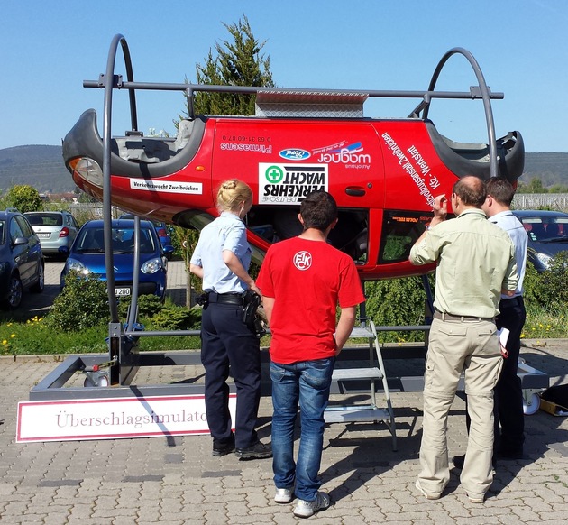 Weiterhin wird ein Rettungssimulator der BASF eingesetzt. Damit können die Teilnehmer nach einer zehnminütigen Einführung eindrucksvoll erleben, welche Einwirkungen ein Überschlag mit einem Fahrzeug hat und wie der Sicherheitsgurt Verletzungen vermindern oder sogar vermeiden kann. Dabei wird ein PKW an einer Halterung auf den Kopf gedreht, um das Lösen des Sicherheitsgurtes und das Befreien nach einem Verkehrsunfall zu üben. Insbesondere die Problematik der Orientierung und die notwendigen Abstützkräfte in Verbindung mit der erforderlichen Abrollübung lassen eventuell auftretende Panik-Attacken im Vorfeld vermeiden.
