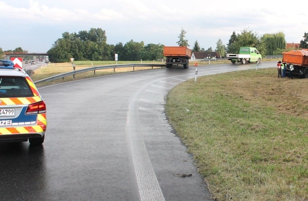 Am Dienstag, dem 12.07.2016, gegen 19:28 Uhr, befuhr der 46-jährige Fahrer aus der Südpfalz mit seinem orangefarbenen Kipplaster nebst Anhänger zunächst die Bundesstraße 9 in Richtung Speyer, um dann am Autobahnkreuz Oggersheim in die Auffahrt zur A 650 in Richtung Mannheim abzubiegen. Wegen eines verspätet vor ihm ebenfalls abbiegenden schwarzen PKW, so der LKW-Fahrer bei der Verkehrsunfallaufnahme, habe er stark abbremsen müssen. Der unbeladene Anhänger drückte auf das Zugfahrzeug, stellte sich leicht quer, was zur Folge hatte, dass die Deichsel abriss und der Anhänger alleine weiterfuhr, bis an der Schutzplanke schräg zur Fahrbahn stehen blieb. Personen wurden nicht verletzt. Es entstand ein Gesamtsachschaden von ca. 7000 Euro. Die Autobahnpolizei Ludwigshafen-Ruchheim bittet etwaige Unfallzeugen, die den Unfallhergang beobachtet haben oder Hinweise zu dem schwarzen PKW geben können, sich unter Telefonnummer 06237 9330 zu melden.