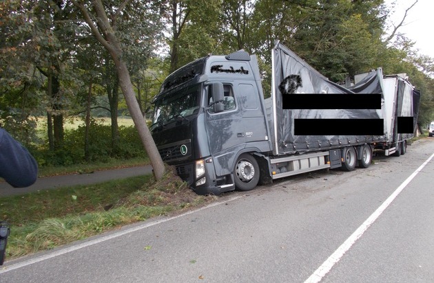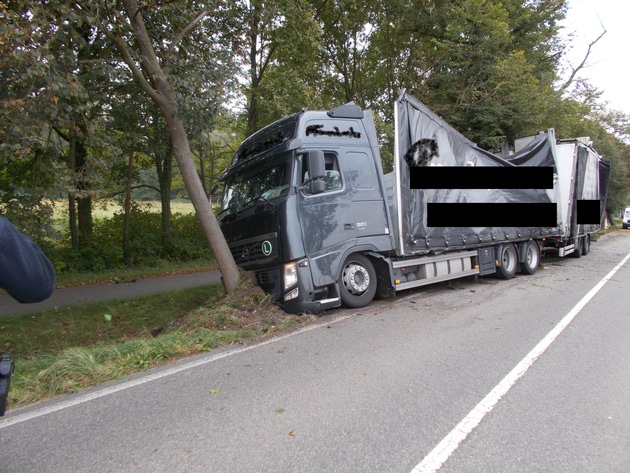 Wie sich jetzt heraus stellte, ereignete sich der Unfall bereits gestern gegen 13.04 Uhr auf der Landstraße 529 (Holiday-Parkstraße), ca. 100 m vor der Einmündung zur B 39 (Nähe Aumühle). Der Lkw-Zug, ein 40-Tonner ohne Ladung, war nach Zeugenangaben Richtung B 39 (Süden) gefahren und ohne erkennbaren Grund oder Beteiligung anderer langsam nach rechts von der Fahrbahn abgekommen. Zunächst streifte er einen ersten Baum und fuhr dann frontal auf den nächsten auf. Dadurch wurde der ältere Lkw total beschädigt und ein Gesamtschaden von ca. 25 000.--EUR verursacht. Der 30-jährige ukrainische Fahrer des Lkw wurde schwer verletzt, aber ansprechbar mit dem Rettungshubschrauber in eine Klinik gebracht. Der fast voll Tank des Lkw wurde bei dem Aufprall beschädigt, sodass Dieselkraftstoff auslief. Die Feuerwehr Haßloch war mit 10 Kräften im Einsatz, nahm des ausgelaufenen Kraftstoff auf und pumpte den Rest ab. Ob Erdreich abgetragen werden muss, entscheidet die Straßenmeisterei. Die L 529 ist wegen der noch laufenden Bergungsarbeiten bis voraussichtlich 18.00 Uhr gesperrt.