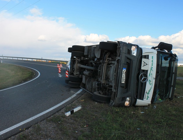 Ein nicht gesicherte Container wurde am 02.11.2016, gegen 13:30 Uhr, einem 33-jährigen Lkw-Fahrer zum Verhängnis. Der aus Speyer stammende Mann befuhr mit seinem Lkw an der Bundesstraße 9 die neue Auffahrt Mutterstadt vom Industriekreisel kommend in Richtung Frankenthal. In der Kurve hob sich der Container, der nur mittels Gurten am Lkw befestigt war, hoch und riss die Gurte ab. Der Container geriet in Schieflage und kippte den Lkw um. Der Lkw kam auf der Grünfläche zwischen Ein- und Ausfädelstreifen zum Liegen. Der Fahrer blieb unverletzt, der Schaden beläuft sich auf ca. 20000 EUR.