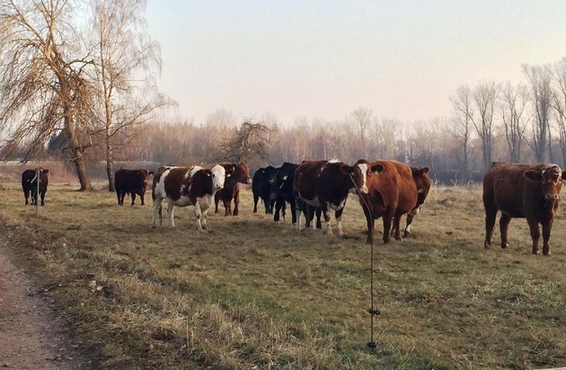Gestern, Sonntag, d. 22.01.2017, unternahm eine Rinderherde zwischen 15:50 Uhr und 17:35 Uhr einen Sonntagsausflug in der Gemarkung Neustadt auf einer Weide zwischen dem Rehbach und dem Streifelsgraben. Spaziergänger meldeten über die Feuerwehr eine Rinderherde auf dem Rad- und Wirtschaftsweg hinter dem Soldatenweiher. Der Weg verläuft unmittelbar neben der BAB 65, in Höhe der AS NW-Nord. Insgesamt zehn Tiere hatten ihre Weide verlassen und liefen im Bereich der dortigen Autobahnunterführung umher. Bei Eintreffen der Streife war es einem beherzten Passanten bereits gelungen, die Tiere wieder auf ihre nahe Koppel zu dirigieren. Die Nachsicht ergab, dass sich der die Weide umgebende Zaun durchgehend in einem maroden Zustand befindet. Der Draht ist verrostet und wird durch Schnüre zusammengehalten. Die Pfosten stehen teilweise sehr schief bzw. sind arg verbogen. An insgesamt drei Stellen, die jeweils mehrere Meter lang waren, lagen die Drähte am Boden, so dass sie kein Hindernis mehr darstellten. Der Zaun war an keiner Stelle mit Strom belegt. Offenbar wird der Zaun nicht kontrolliert oder gar gewartet. Der verantwortliche Pächter konnte weder telefonisch noch an seiner Wohnanschrift erreicht werden. Daher wurde über die Feuerwehr ein anderer Landwirt verständigt, der den Zaun notdürftig instand setzte und nach einer Möglichkeit suchte, den Draht wieder unter Strom zu setzen.