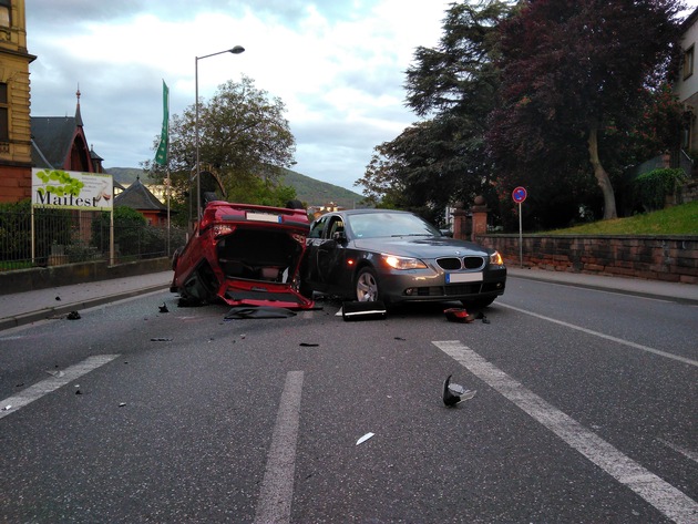 Ein 19 Jahre alter Fahrer aus Mannheim, fuhr mit seinem PKW die Maximimilianstraße in Richtung Zentrum. Kurz nach der Kreuzung Mußbacher Landstraße/ Haardter Straße, verlor der Fahrer die Kontrolle über seinen PKW und kam nach links von der Fahrbahn ab. Er prallte gegen eine Sandsteinmauer mit Eisenzaun, das Fahrzeug überschlug sich und wurde wieder zurück auf die Fahrbahn geschleudert. Hier kam ihm ein weiterer PKW entgegen, dessen Fahrer noch ausweichen konnte, so dass es nicht zu einem Frontalzusammenstoß kam, einen seitlichen Aufprall konnte er aber nicht verhindern. Die Fahrer beider PKW wurden durch den Unfall leicht verletzt, eine medizinische Versorgung war aber nicht nötig.
