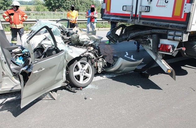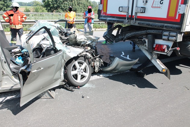 Am heutigen Sonntag, 04.06.17 kam es um 14:15 Uhr auf der BAB 61 in FR Süden in der Gemarkung Schifferstadt zu einem schweren Verkehrsunfall. Der 81 Jahre alte Fahrer eines Pkws fuhr aus noch ungeklärter Ursache frontal und offenbar ungebremst in einen auf der rechten Fahrspur fahrenden Lkw. Der Pkw wurde durch den Zusammenstoß unter dem Auflieger des Lkws eingeklemmt und fast 300 m weit mitgeschleift. Der Fahrer, sowie seine 77-jährige Beifahrerin, beide aus Baden-Württemberg, wurden in dem Fahrzeug eingeklemmt und mussten von der Feuerwehr mit schwerem Gerät aus dem Fahrzeug befreit werden. Anschließend wurden beide Personen von den zwei vor Ort befindlichen Rettungshubschraubern in die naheliegende BG-Unfallklinik nach Ludwigshafen verbracht. Wegen der Landung der Hubschrauber, sowie zur Bergung der Unfallfahrzeuge musste die BAB 61 in Fahrtrichtung Süden für ca. anderthalb Stunden voll gesperrt werden, was zu einer nicht unerheblichen Staubildung geführt hat. Der Sachschaden dürfte sich ersten Schätzungen zufolge auf ca. 15.000 Euro belaufen. Der Lkw-Fahrer wurde nicht verletzt und konnte seine Fahrt im Anschluss, zumindest bis auf den nahegelegenen Parkplatz, fortsetzen. Neben der Streife der Autobahnpolizei Ruchheim waren 24 Mann der freiwilligen Feuerwehr Schifferstadt mit sechs Fahrzeugen, der Rettungsdienst mit 5 Fahrzeugen, zwei Hubschraubern und 14 Mann, sowie die Autobahnmeisterei mit zwei Fahrzeugen und vier Mann im Einsatz. Darüber hinaus wurde von der Polizei noch die Tierrettung verständigt, da sich in dem verunfallten Fahrzeug auch noch drei Hunde befanden, welche jedoch augenscheinlich unverletzt blieben.