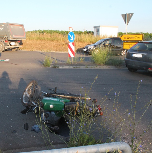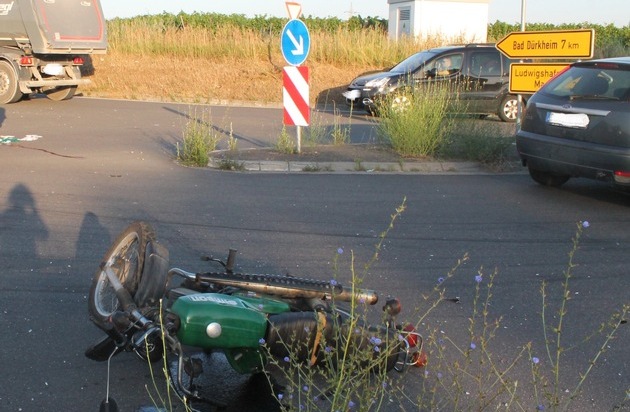 Schwere, jedoch glücklicherweise nicht lebensgefährliche Verletzungen erlitt ein 59-jähiger Fahrer eines Kleinkraftrades (KKR). Dieser war am 05.07.17, gegen 06:20 Uhr mit seinem KKR aus Maxdorf kommend auf der L 527 in Richtung Kreisel an der Anschlussstelle der A 650 - Gönnheim / Friedelsheim unterwegs. An der Kreuzung L 527 / L 526 (sog. Feuerbergkreuzung) missachte ein von Ellerstadt kommender 55-jährige Fahrer eines Ford, der die Kreuzung in Richtung Erpolzheim überqueren wollte, die durch Verkehrszeichen geregelte Vorfahrt des 59-Jährigen und es kam zum Unfall. Der schwer verletzte 59-Jährige wurde in ein Krankenhaus in Ludwigshafen eingeliefert. Der Unfallverursacher blieb unverletzt. Der entstandene Sachschaden beläuft sich auf ca. 5.500.- Euro.