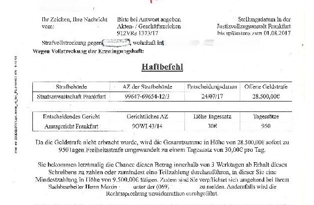 Eine 80-jährige Frau aus Bad Dürkheim erstattete bei der Polizei am 26.07.17 eine Anzeige wegen Betrug. Ihr war per Post ein "Haftbefehl" zugestellt worden. Das Anschreiben verursachte wegen seines auf den ersten Blick offiziellen Aussehens zunächst Unbehagen und Erschrecken. Gefordert wurden in dem Schreiben 28.500 Euro, ersatzweise werden zweieinhalb Jahre Haft für den Empfänger der Nachricht angedroht. Erst bei näherem Hinsehen wurde deutlich, dass dieses Schreiben eine Totalfälschung ist. Die Frau hat umsichtig reagiert und sich sofort an die Polizei gewandt, so dass ihr kein Schaden entstanden ist. . Personen, die ebenfalls ein "Haftbefehl" erhalten haben, mögen sich bitte mit der Polizeiinspektion Bad Dürkheim, Tel. 06322/963-0, oder pibadduerkheim@polizei.rlp.de in Verbindung setzen.