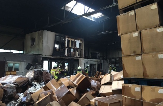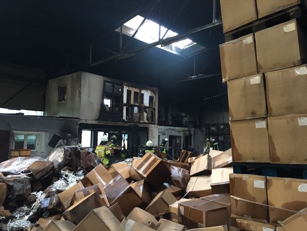 Heute in den frühen Morgenstunden kam es aus bisher ungeklärter Ursache zu einem Brand einer ca. 1000m² großen Lagerhalle einer Spedition. Als die Einsatzkräfte am Brandort eintrafen, stand die Halle bereits in Flammen. Die Feuerwehr ist aktuell noch mit der Brandbekämpfung beschäftigt, weil hauptsächlich Holzkohle / Aktivkohle in sog. Big-Packs Feuer gefangen hat. In den Räumlichkeiten sind u.a. Verpackungsmaterialien, Paletten, Kartonagen, und Kunststoff-PET-Flaschen gelagert. Zur Höhe des Sachschadens können noch keine Angaben gemacht werden (sicherlich im 6-stelligen Bereich...). Nach Angaben der Feuerwehr brach das Feuer etwa in der Mitte des Raumes aus.