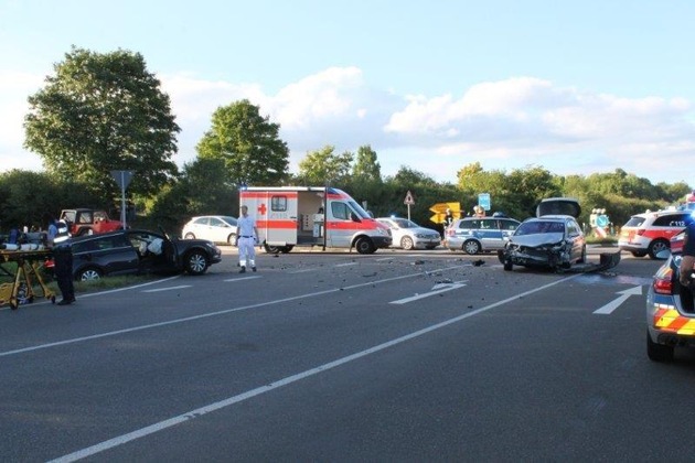 In den frühen Abendstunden wurde auf der B 271 ein schwerer Unfall bei Bockenheim gemeldet. Ein 50-Jähriger aus Grünstadt wollte in Höhe der L 516 mit seinem PKW nach links Richtung Asselheim einbiegen, als er den Vorrang eines PKW im Gegenverkehr missachtete. Dort, aus Richtung Bockenheim, fuhr ein 40-Jähriger Mannheimer mit Frau und Kind. Nach seinen Angaben bremste er noch ab, konnte aber den Frontalzusammenstoß nicht vermeiden. Beim Aufprall wurden alle vier Beteiligten verletzt. Der Unfallverursacher erlitt Abschürfungen am Unterarm und verstauchte sich die Hand. Der 40-Jährige erlitt Schnittverletzungen und Prellungen an den Armen, sowie ein HWS. Seine Frau hingegen hatte sich die linke Hand gebrochen und sie erlitt, wie das 5-jährige Kind, Rippenprellungen, weshalb beide zur Beobachtung im Krankenhaus verbleiben. An den PKW entstand jeweils Sachschaden in Höhe von 8.000 Euro.