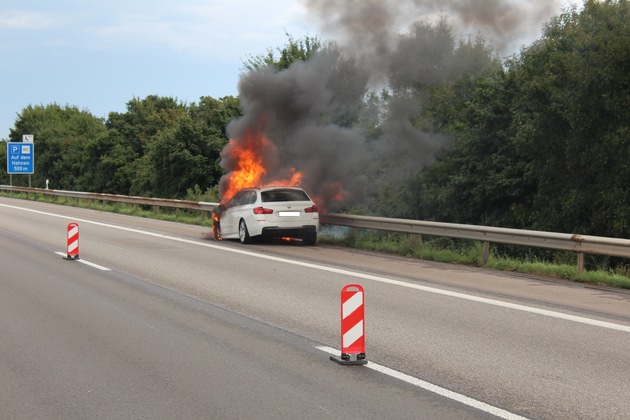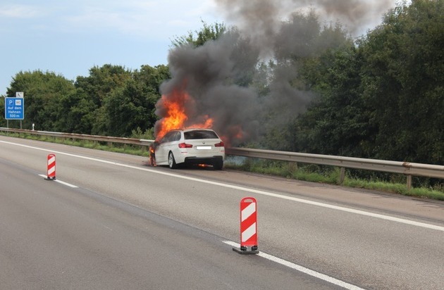 Der Fahrer eines 5er BMWs aus dem Kreis Heilbronn musste sein Fahrzeug aufgrund eines technischen Defektes gegen 14:47 Uhr auf dem Notstreifen abstellen. Unmittelbar darauf geriet das Fahrzeug in Brand und brannte komplett aus.