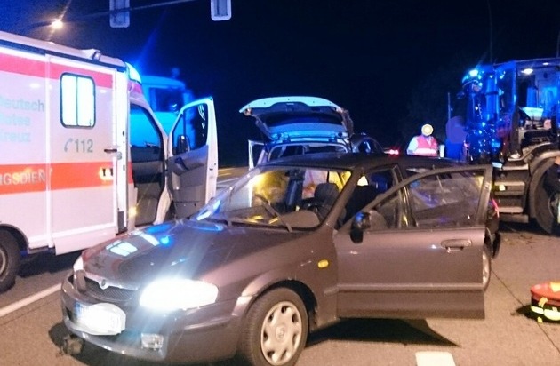 Ein 55-jähriger Mazda-Fahrer befuhr am 27.09.17, gegen 05:40 Uhr, die Bruchstraße vom Industriegebiet kommend in Fahrtrichtung Bruchwegkreuzung / B 271. An der Kreuzung fuhr er in diese ein ohne auf einen von rechts kommenden, vorfahrtsberechtigten Pkw Ford zu achten, der von einem 31-jährigen Mann gelenkt wurde und der Ford-Fahrer prallte in die rechte Seite des Mazda. Dieser wurde durch die Wucht des Aufpralls noch gegen einen wartenden Lkw Scania geschleudert, der von der B 271 kommend auf der Linksabbiegerspur in Richtung Stadtmitte stand. Die beiden Pkw-Fahrer wurden mit leichten Verletzungen in ein Krankenhaus eingeliefert. Beide Pkw waren nicht mehr fahrbereit und mussten abgeschleppt werden. An dem Lkw wurde u.a. auch ein Reifen beschädigt, der gewechselt werden musste. Der entstandene Sachschaden wird auf ca. 19.000 Euro beziffert.-