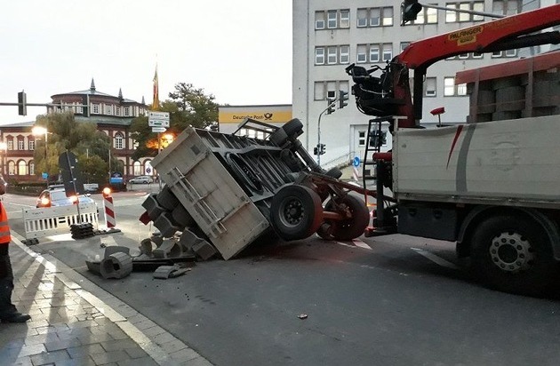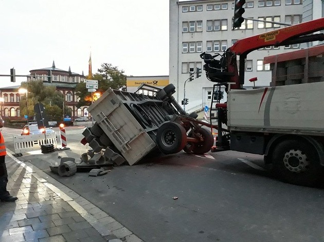 Ein mit Steinen beladener Lkw mit Anhänger startete am 02.10., kurz vor 07:00 Uhr in der Landauer Straße, Höhe Einmündung zum Alten Viehberg ein Wendemanöver. Hierbei verrutschte die LKW-Ladung und der Anhänger kippte um. Der Anhänger musste durch einen Spezialfahrzeug wieder aufgerichtet werden. Infolge einer Baustelle war der dortige Bereich für den Fahrzeug schon vorher gesperrt, so dass der Unfall keine Auswirkungen auf den fließenden Verkehr hatte. Personen wurden beim dem Unfall nicht verletzt; am Anhänger entstand ein Schaden von ca. 10.000EUR.