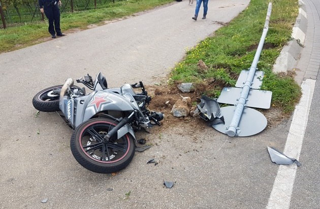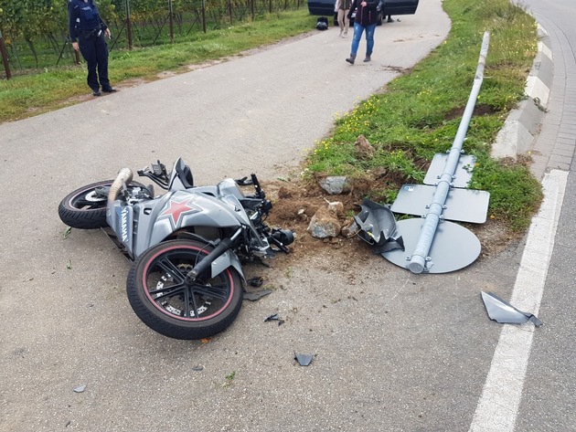 Am Donnerstag, kurz vor 13.00 Uhr, befuhr eine 16-jährige Fahrerin eines Leichtkraftrades die L517 von Weisenheim am Berg kommend in Richtung Bobenheim am Berg. Kurz nach dem Ortseingang kam sie wohl in Folge Unachtsamkeit von der Fahrbahn ab und kollidierte mit einem Verkehrsschild. Die leichtverletzte Fahrerin wurde zur weiteren Behandlung in das Krankenhaus verbracht.