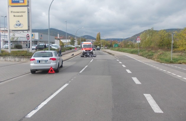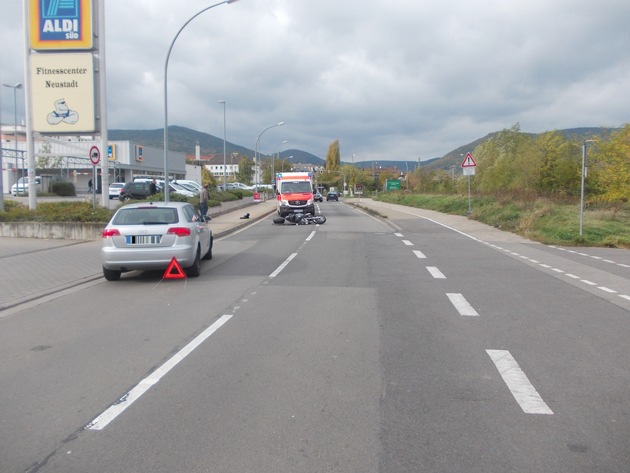 Einen schwer verletzten Motorradfahrer fordert heute um 12.40 Uhr ein Verkehrsunfall in der Speyerdorfer Straße. Beim Überholen einer Fahrzeugschlange übersah ein 52-jähriger Motorradfahrer aus dem Landkreis einen entgegenkommenden Linksabbieger aus Neustadt. Es kam zum Zusammenstoß zwischen Motorrad und Pkw. Der Motorradfahrer erlitt einige Brüche und musste in die Unfallklinik nach Ludwigshafen gebracht werden. Lebensgefahr bestand nach ersten Erkenntnissen zum Glück nicht. Die Polizei schätzt den Sachschaden auf ca.10000 Euro.