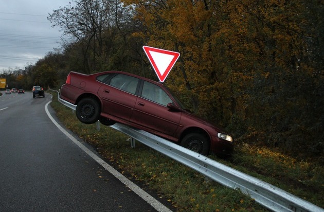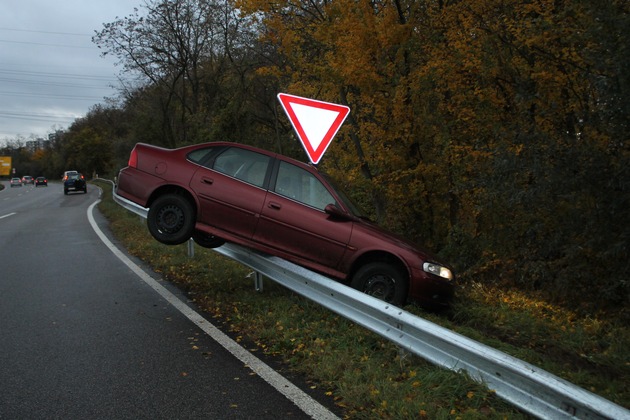 Glück im Unglück hatte ein 60-jähriger Autofahrer aus dem Saarland, als er am heutigen Samstag gegen 15:45 Uhr in der Überleitung der BAB 6 auf die B 9 in Richtung Ludwigshafen aufgrund nasser Fahrbahn und nicht angepasster Geschwindigkeit die Kontrolle über sein Fahrzeug verlor. Er geriet zunächst in den Grünstreifen und schlitterte anschließend ca. 10 Meter über die Schutzplanken, wo er nach dem Aufprall gegen ein Schild zum Stehen kam. Am Fahrzeug, den Schutzplanken und dem Verkehrsschild entstand ein Gesamtschaden in Höhe von ca. 2000 Euro. Der Fahrer blieb unverletzt. Zur Bergung des Fahrzeugs wurde ein Abschleppfahrzeug mit Kran benötigt, zudem musste die Ausfahrt kurzzeitig voll gesperrt werden. Den Fahrer erwartet ein Bußgeld in Höhe von 145 Euro, sowie einen Punkt in Flensburg.