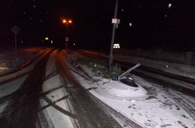 Auf schneeglatter Straße verlor gestern Abend (03.12.2017, 22.15 Uhr) ein 22-Jähriger auf der Herxheimer Straße in Weisenheim am Berg die Kontrolle über seinen Mercedes. Das Auto rutschte auf eine Verkehrsinsel und beschädigte dort eine Laterne und ein Verkehrsschild. Der Mercedes wurde dabei so stark beschädigt, dass er nicht mehr fahrbereit war und abgeschleppt werden musste. Die Gesamtschadenshöhe beträgt rund 6.000 EUR. Der 22-Jährige blieb glücklicherweise unverletzt.