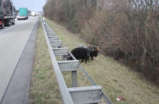Am Dienstag dem 12.12.2017 zwischen 13:00 und 14:00 Uhr hielten drei ausgebüchste Schafsböcke die Autobahnpolizei Ruchheim auf Trapp. Der Polizeiautobahnstation Ruchheim waren von mehreren Verkehrsteilnehmern Schafe auf der Fahrbahn der BAB 61 Fahrtrichtung Süden, zwischen Parkplatz "Erpelrain" und dem Autobahnkreuz Frankenthal, gemeldet waren. Die Beamten konnten vor Ort drei ausgewachsene Schafsböcke unmittelbar neben der Fahrbahn feststellen. Vorsorglich wurde die rechte Fahrspur in diesem Bereich gesperrt. In Kooperation mit der Autobahnmeisterei Ruchheim wurde "das Problem bei den Hörnern gepackt" und die Tiere eingefangen. Anschließend wurden die Schafsböcke mit einem Lkw der Autobahnmeisterei abtransportiert. Die Schafsböcke wurden zu dem landwirtschaftlichen Betrieb in Großniedesheim, von dem sie abgängig waren, wohlbehalten zurück gebracht. Weder Mensch noch Tier wurden bei dem Einsatz verletzt.