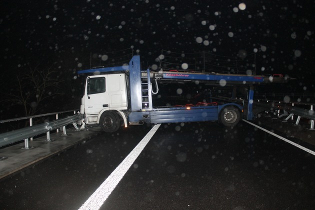 Am 19.12.2017, 19:25h befuhr ein 43-jähriger aus dem Rhein-Erft-Kreis mit seinem leeren Autotransporter die BAB 61 in Richtung Koblenz. An der AS Speyer wollte er auf die B9, Richtung Ludwigshafen wechseln. Aufgrund seiner zu hohen Geschwindigkeit kam er in der dortigen, langgezogenen, Rechtskurve in Schleudern. Der Lkw mit Anhänger stellte sich in der Folge quer und wurde zwischen den rechten und linken Schutzplanken eingeklemmt. Die Tangente zur B9 war bis 23:00h gesperrt. Glücklicherweise wurde der Lkw-Fahrer nicht verletzt. Es entstand ein Sachschaden von 20.000.-. Im Einsatz waren die Autobahnpolizei Ruchheim mit 2 Fahrzeugen, die AM Ruchheim und ein Bergungsunternehmen.