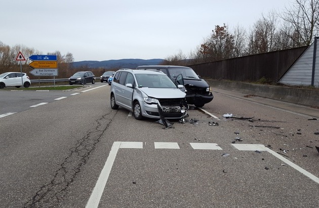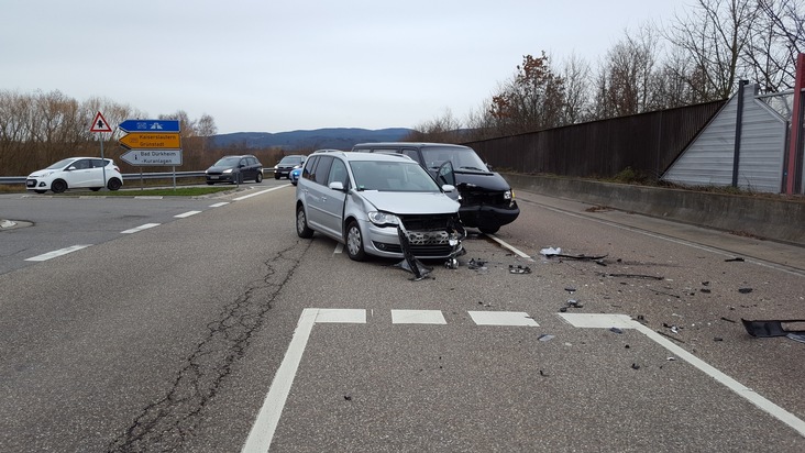 Am Freitag 29.12.2017, um 14.30 Uhr kam es auf der B 271 an der Auffahrt von der B 37 zu einem Verkehrsunfall mit Personenschaden. Der Pkw VW Touran eines 40-jährigen Türken aus Mannheim befuhr die Auffahrt von der B 37 zur B 271. An der dortigen Einmündung übersah dieser den Pkw VW Transporter eines 50-jährigen Wachenheimers, der die B 271 aus Richtung Wachenheim kommend in Fahrtrichtung Bruch befuhr. Der VW Transporter versuchte noch nach links auszuweichen, konnte einen Zusammenstoß nicht mehr verhindern. Durch den Zusammenstoß wurden der Fahrer des Tourans sowie dessen beiden Insassen leicht verletzt. Der Fahrer des Transporters und dessen Beifahrerin kamen ebenso verletzten sich ebenfalls. Alle Beteiligten kamen zur Untersuchung ins Krankenhaus. Die B 271 musste für eine 1/2 Stunde voll gesperrt werden. Beide Fahrzeuge waren nicht mehr fahrbereit und wurden abgeschleppt. Der Gesamtschaden beläuft sich auf ca. 20.000 EUR.