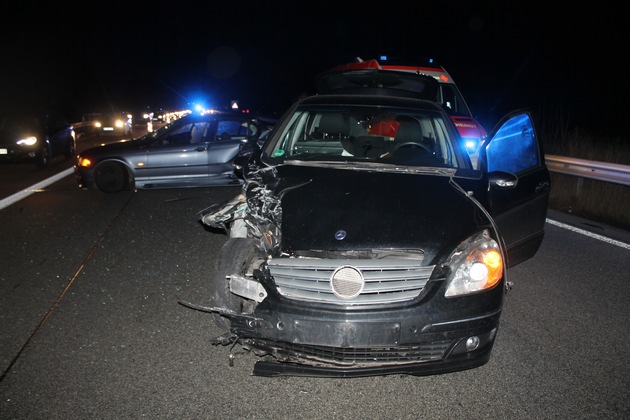 Am Sonntag, 21.01.2018 um 21:38 Uhr kam es auf der BAB 61 in Fahrtrichtung Speyer kurz nach dem Autobahnkreuz Worms zu einem Verkehrsunfall mit zwei schwerverletzten Personen. Ein 45-jähriger Mercedesfahrer aus Baden-Württemberg übersah aus bislang unbekannten Gründen den vor ihm fahrenden BMW eines 50-jährigen und fuhr diesem hinten auf. Durch die Wucht des Aufpralls wurde der Mercedes des Unfallverursachers anschließend nach rechts in die Schutzplanke und von dort in die Mittelschutzplanke geschleudert. Bei dem Unfall wurden sowohl der Unfallverursacher, als auch der Beifahrer im BMW schwer verletzt. Der Fahrer des BMWs wurde zudem leicht verletzt. An beiden Fahrzeugen entstand wirtschaftlicher Totalschaden. Die Gesamtschadenshöhe dürfte sich auf ca. 25.000 Euro belaufen.