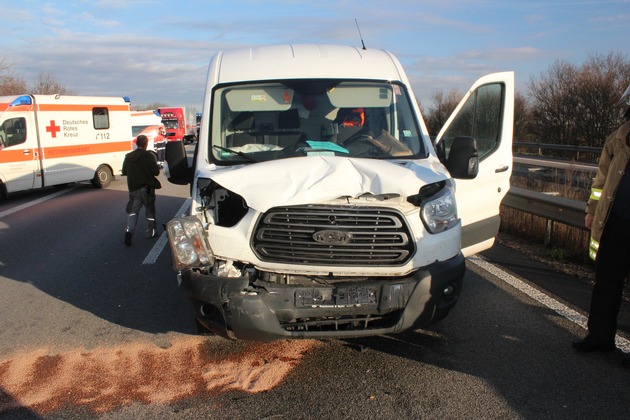 Am 30.01.2018 um 09:30h kam es auf der A61 Rtg. Speyer bei km 356 (Gemarkung FT-Eppstein) zu einem Unfall mit 3 leichtverletzten Personen. Nach Rekonstruktion der Autobahnpolizei fuhr ein 47-jähriger Fahrer eines Kleintransporters aus Wiesbaden in Folge Unachtsamkeit und mangelndem Sicherheitsabstand auf ein Stauende auf. Hier kollidierte er mit dem vorausfahrenden Mercedes eines 55-jährigen Geschäftsreisenden aus dem Kreis Saarlouis. Sowohl der Fahrer des Kleintransporters als auch sein Beifahrer wurden durch den Aufprall verletzt und anschließend in ein nahegelegenes Krankenhaus verbracht. Auch der PKW-Fahrer klagte über leichte Verletzungen und will sich selbstständig noch in ärztliche Untersuchung begeben. Beide Fahrzeuge waren infolge des Aufpralls nicht mehr fahrbereit und mussten abgeschleppt werden. Die Fahrbahn in Richtung Speyer war für ca. 30 min. voll gesperrt, auch weil ein hinzugerufener Rettungshubschrauber auf der Autobahn landete. Es kam zu erheblichen Verkehrsbeeinträchtigungen. Neben der Autobahnpolizei waren 2 RTW, ein Notarztwagen, die Autobahnmeisterei sowie mehrere Einsatzwagen der Feuerwehr im Einsatz. Der Gesamtsachschaden beläuft such auf ca. 14.000 Euro.