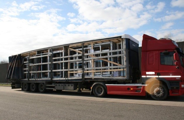 Am Dienstag (30.01.2018) gegen 12:30 Uhr, wurde von Kräften des Schwerverkehrskontrolltrupps ein bulgarischer Sattelzug auf der BAB 61, Fahrtrichtung Koblenz, am Parkplatz "Auf dem Hahnen" angehalten und kontrolliert. Aufgefallen war der Transport, da der Sattelauflieger von den Abmessungen her augenscheinlich deutlich zu hoch erschien. Eine Messung der konkreten Höhe ergab, dass die maximal zulässige Höhe von 400 cm um satte 14 cm überschritten war. Die Ladung bestand aus 12 Tonnen Fenster- bzw. Türrahmen, die so hoch geladen waren, dass das Dach des Sattelaufliegers nach oben gedrückt wurde. Gerade bei der Durchfahrt von Brücken kann es hierbei zu erheblichen Problemen kommen. Bei der Überprüfung des technischen Zustands fiel den eingesetzten Beamten auf, dass die Bremse an der zweiten Achse links absichtlich außer Betrieb gesetzt worden war. An dieser Bremse war der Federspeicher herausgedreht worden, sodass die Bremszange entlastet war und sich das Rad wieder drehen konnte. Beide Bremsleitungen des Membranbremszylinders waren komplett abgebaut und mit einer Verschraubung verschlossen worden, damit keine Druckluft entweicht. Dem bulgarischen Lkw-Fahrer wurde die Weiterfahrt untersagt, bis der erhebliche technische Mangel behoben ist, des Weiteren muss die Ladung vor Ort auf ein geeignetes Fahrzeug umgeladen werden. Den Fahrer, den Halter und den Verlader erwarten zudem Bußgeldverfahren mit nicht unerheblichen Bußgeldern.