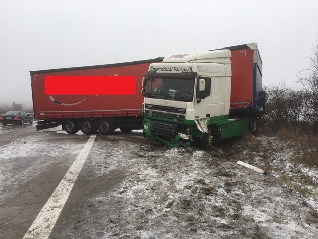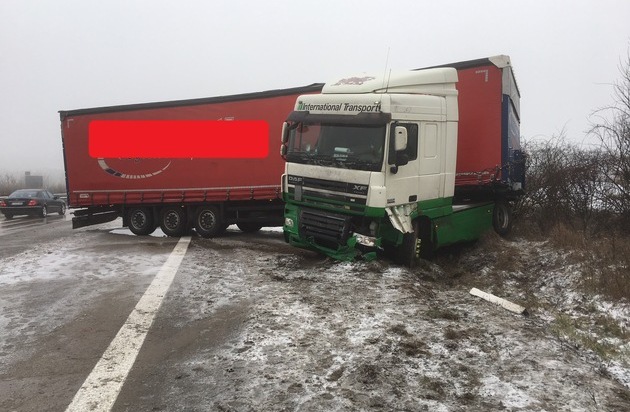 Am heutigen Donnerstag um 08:45 Uhr ereignete sich auf der BAB 6 zwischen den Anschlussstellen Grünstadt und Wattenheim in Fahrtrichtung Saarbrücken ein Verkehrsunfall in dessen Folge sich ein 40-Tonner auf der Fahrbahn quer stellte. Der 37-jährige Lkw-Fahrer aus Rumänien verlor aufgrund der nicht an die Witterungsverhältnisse angepassten Geschwindigkeit die Kontrolle über seinen Lkw und kam nach rechts von der Fahrbahn ab. Dort prallte er gegen die Schutzplanken und der Lkw kam quer auf der Fahrbahn zum Stehen. Der 37-jährige wurde bei dem Unfall leicht verletzt; der Sachschaden dürfte sich auf ca. 35.000 Euro belaufen. Bei der anschließenden Unfallaufnahme konnte festgestellt werden, dass der Lkw mit Winterreifen ausgerüstet war und auch die Ladung, welche aus elf Tonnen Papierrollen bestand, ordnungsgemäß gesichert war. Aufgrund des Unfalls war nur der linke Fahrstreifen befahrbar, wodurch es zu Staubildung kam. Zur Bergung des Lkws musste zudem die Autobahn kurzzeitig voll gesperrt werden. Die Bergung, zur der auch ein Kran eingesetzt werden muss, wird bis ca. 12:00 Uhr andauern. Neben zwei Streifen der Autobahnpolizei Ruchheim war die freiwillige Feuerwehr Grünstadt mit drei Fahrzeugen und zwölf Mann im Einsatz, außerdem die Autobahnmeisterei Wattenheim mit zwei Fahrzeugen.