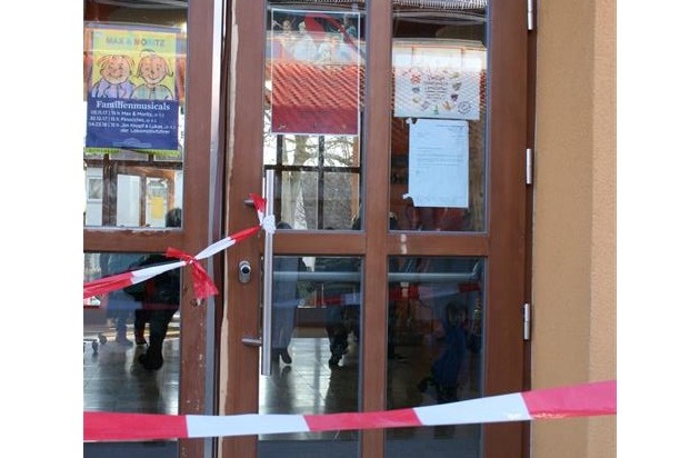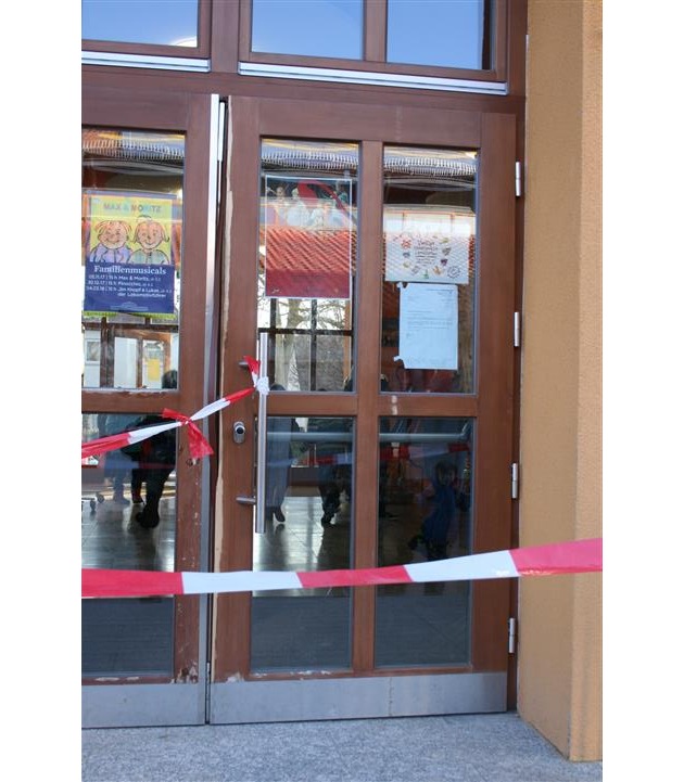 Unbekannte Täter sind über die Eingangstür an der Gebäuderückseite, vom Schulhof her, in die Grundschule Dirmstein eingebrochen. Die Aluleiste eines Türblatts wurde dabei komplett herausgebrochen. Es wurden blaue Lackanhaftungen sichergestellt, die vom Einbruchswerkzeug stammen (vermutlich ein Brecheisen).