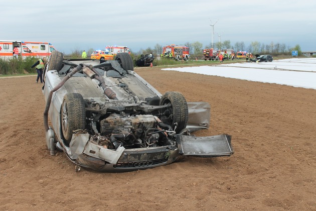 Ein Leichtverletzter und zwei Schwerverletzte ist das Resultat eines spektakulären Verkehrsunfalls, der sich auf der BAB 65 in Richtung Neustadt, kurz vor der Anschlussstelle Haßloch, am Dienstag den 10.04.2018 gegen 18:20 Uhr ereignete. Beteiligt waren ein VW Passat, ein Audi TT und ein Renault Clio. Der genaue Unfallhergang konnte bisher noch nicht ermittelt werden. Doch der Audi TT kam nach rechts von der Fahrbahn ab und landete nach einem ca. 15m weiten Sprung in einem angrenzenden Feld, überschlug sich und kam letzten endlich auf dem Dach liegend zum Stehen. Der 49-jährige Fahrer wurde schwer verletzt ins Krankenhaus eingeliefert. Der VW Passat überschlug sich ebenfalls durch den Verkehrsunfall und blieb neben der Fahrbahn auf einem Feldweg auf dem Dach liegend liegen. Der 22-jährige polnische Fahrer wurde ebenfalls schwerverletzt in ein Krankenhaus gebracht. Der 35-jährige Fahrer des Renault Clio kam ebenfalls nach rechts von der Fahrbahn ab und blieb in einem anderen angrenzenden Feld zum Stehen. Der Fahrer wurde mit leichten Verletzungen ins Krankenhaus eingeliefert. Die linke Fahrspur der BAB 65 musste für ca. zwei Stunden gesperrt werden, was zu erheblichem Rückstau führte. Mehrere Rettungswagen und die Feuerwehr der Verbandsgemeinde Dannstadt war mit großer Fahrzeug- und Mannstärke im Einsatz. Ebenso wie vier Polizeibeamten der Polizeiautobahnstation Ruchheim. Zeugen, die den Unfallhergang beobachtet hatten, werden gebeten sich bei der Polizei in Ruchheim unter der Telefonnummer: 06237/933-0 zu melden.