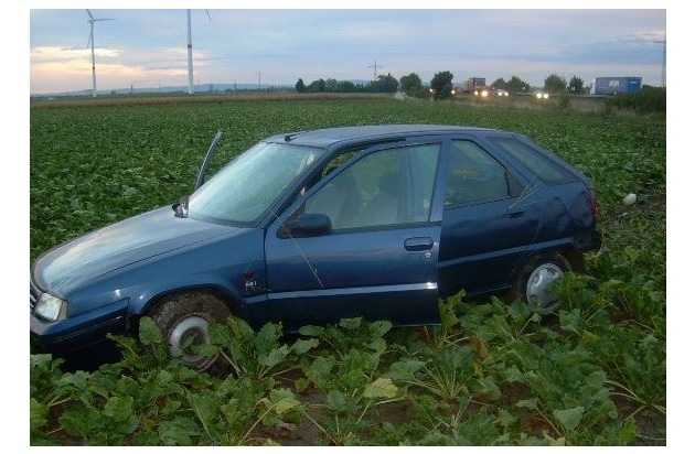 ***, den 15.09.2015, 06.45 Uhr*** Ein 42- jähriger PKW- Fahrer, der die B 9 in Richtung Germersheim befuhr, kam vermutlich wegen nicht angepasster Geschwindigkeit und Unachtsamkeit nach rechts von der B 9 ab und geiet über den Seitenstreifen auf den Acker. Dort blieb er ca. 50 Meter vom Fahrbahnrand stecken. Der Unfallverursacher wurde nicht verletzt, am PKW entstand wirtschaftlicher Totalschaden von ca. 7000 Euro.