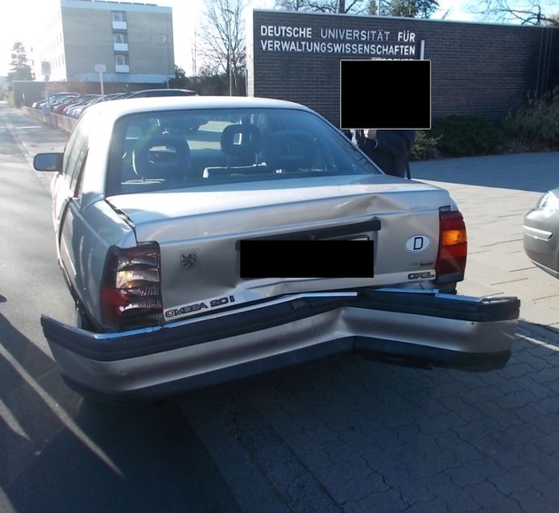 *, den 16.11.2015, 09.55 Uhr* Ein 76- jähriger PKW- Fahrer befuhr die B 9 in Fahrtrichtung Ludwigshafen. An der Anschlussstelle Speyer- Dudenhofen wollte der Mann die B 9 in Richtung Innenstadt verlassen. Plötzlich fuhr ein unbekannter Fahrzeugführer mittig auf das Fahrzeug des Geschädigten auf, beschädigte dieses erheblich, überholte den beschädigten PKW und entfernte sich unerlaubt von der Unfallstelle. Der Geschädigte war durch den Unfall derart geschockt, dass er sich nur an ein kleines graues Auto erinnerte. Der Schaden wird auf 1500 Euro geschätzt. Zeugen, die den Unfallbeobachtet haben, werden gebeten sich mit der Polizei Speyer in Verbindung zu setzen.