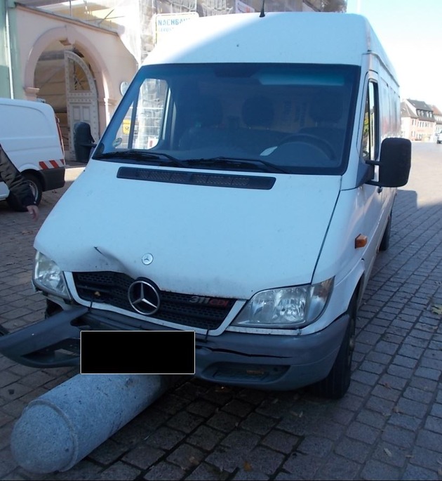 *, den 16.11.2015, 11.30 Uhr* Ein 75- jähriger Fahrer eines Transporters fuhr über den Domplatz und kam aus Unachtsamkeit zu weit nach rechts. Dabei stieß er gegen einen Poller und beschädigte sein Fahrzeug und den Poller schwer. Der Schadenbeträgt ca. 4000 Euro.