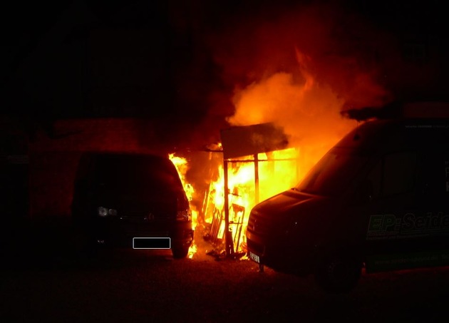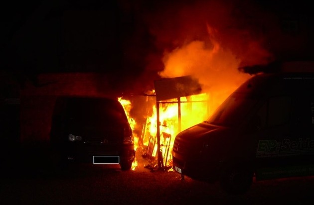 Am 28.12.2015, 02.43 Uhr, wurde ein Gebäudebrand in der Wormser Straße in Speyer gemeldet. Aus bisher noch unklarer Ursache war in einem Werkstatt-/Geräteschuppen ein Feuer ausgebrochen, welches auf 2 in unmittelbarer Nähe parkende Fahrzeuge (Pkw Transporter) übergriff. Der Schuppen, sowie die beiden Fahrzeuge brannten völlig aus. Sachschaden ca. 100.000 Euro. Menschen kamen nicht zu Schaden. Vorsorglich wurde ein unmittelbar angrenzendes Fachwerkhaus von der Polizei evakuiert. Die 14 Bewohner dieses Hauses wurden kurzfristig im Vorraum einer naheliegenden Bank untergebracht. Die Feuerwehr Speyer hatte den Brand schnell unter Kontrolle. Ermittlungen bezüglich der Brandursache laufen.
