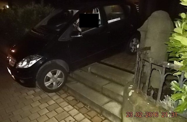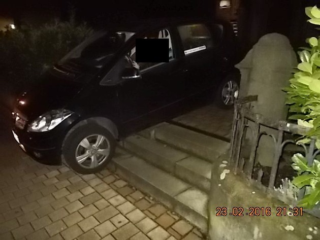 *, den 23.202.2016, 20.10 Uhr* Ein 58- jähriger ortsunkundiger PKW- Fahrer wollte den Parkplatz der Josefs Kirche in der Gilgenstraße verlassen und ging irrigerweise davon aus, dass es sich bei der dreistufigen Treppe um eine Rampe handele. Der Mann setzte seinen PKW auf und musst durch einen Abschleppdienst befreit werden. Es war ein Schaden von ca. 1700 Euro entstanden.