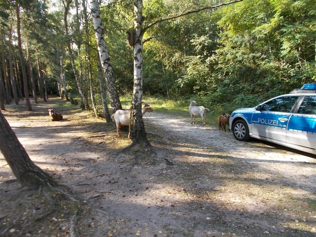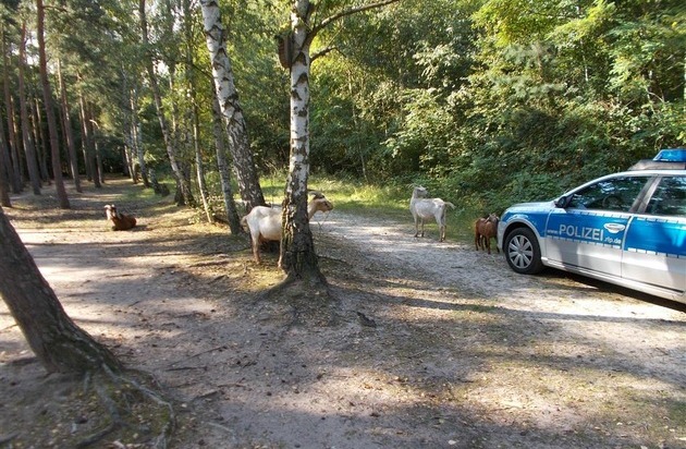 Am Morgen des 18.08.2016, meldeten sich Spaziergänger aus dem Waldstück um den Maxdorfer-Weiher bei der Polizei und gaben an, dass sie sieben freilaufende Ziegen entdeckt haben. Als die Beamten vor Ort eintrafen, wurden sie von den Tieren freudig empfangen. Langwierige Ermittlungen erbrachten schließlich, dass die Ziegen aus einem Gehege in unmittelbarer Nähe zum Fundort stammten. Wie die Tiere entkommen waren ist unklar, sie konnten aber durch den Verantwortlichen zurück in ihr Gehege gebracht werden.