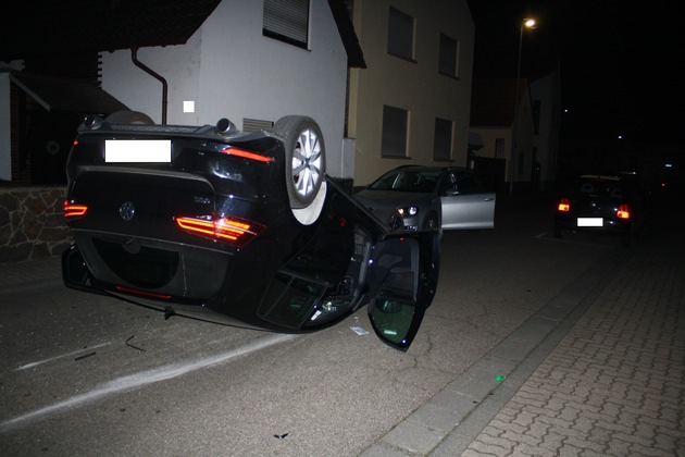 In der Nacht zu Freitag gegen 02:40 Uhr ereignete sich in der Lillengasse ein schadensträchtiger Unfall. Ein VW Golf ist von der Fahrbahn abgekommen, gegen einen geparkten Smart gestoßen und dann an einem Haus entlang geschrammt. Dadurch kam der Golf ins Schleudern, überschlug sich und landete schließlich auf dem Dach. Ein Zeuge meldete der Polizei, dass vier Insassen aus dem Pkw ausgestiegen und weggerannt sind. Nach etwa 15 Minuten kam der Fahrer des Unfallwagens aber wieder zurück. Er gab an, während der Fahrt nach seiner Geldbörse gesucht zu haben und deshalb gegen den Smart gefahren zu sein. Hinweise aus Alkoholkonsum ergaben sich nicht. Keiner der Insassen ist verletzt worden. An beiden Fahrzeugen entstand Totalschaden. Insgesamt beläuft sich der Schaden auf etwa 45.000 Euro. Der 23-jährige muss sich nun in einem Verfahren wegen Verkehrsunfallflucht verantworten. Zeugen, die weitere Angaben zum Unfallhergang machen können, werden gebeten, sich mit der Polizei Schifferstadt unter 06235 495-0 oder pischifferstadt@polizei.rlp.de in Verbindung zu setzen.