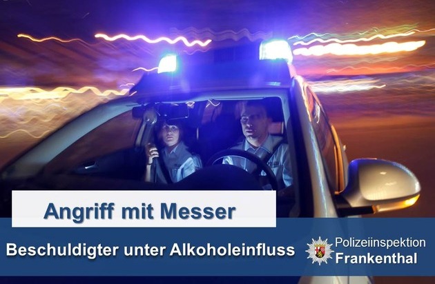 In der Nacht von Mittwoch auf Donnerstag wird ein 50-jähriger Frankenthaler in der Albertstraße in Frankenthal von einem 28-jährigen Ludwigshafener angegriffen. Der Ludwigshafener verletzt den Frankenthaler bei dem Angriff mit einem Messer. Der Frankenthaler wird aber nur leicht verletzt. Der Grund des Streites kann nicht ermittelt werden. Der Angreifer ist beim Angriff erheblich alkoholisiert. Zur Feststellung der Schuldfähigkeit wird dem Beschuldigten eine Blutporbe entnommen. Gegen ihn wird nun wegen Gefährlicher Körperverletzung ermittelt.