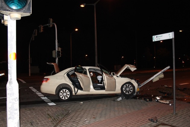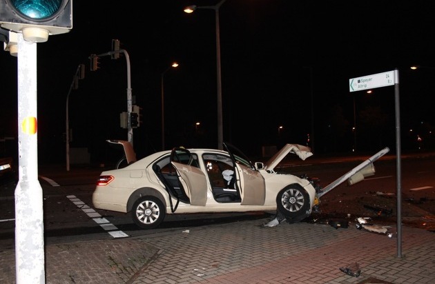 Am frühen Sonntagmorgen gegen 04:05 Uhr kam es zu einem Verkehrsunfall in der Hauptstraße, bei welchem neben hohem Sachschaden auch zwei Leichtverletzte zu beklagen waren. Hier hatte zunächst ein 22-jähriger Mann aus Ludwigshafen, welcher mit seinem Fahrzeug in Fahrtrichtung Innenstadt fuhr, nach links auf die B44 abbiegen wollen. Dabei missachtete er vermutlich die Vorfahrt eines entgegenkommenden 40-jährigen Taxifahrers aus Ludwigshafen, der seinerseits nach rechts auf die B44 abbiegen wollte. Im Kreuzungsbereich fuhren beide Fahrzeuge frontal ineinander. Durch den Zusammenprall wurde das Fahrzeug des Unfallverursachers auf eine Verkehrsinsel geschleudert. Das Fahrzeug des Vorfahrtsberaubten wurde auf den Gehweg geschleudert, wo es schlussendlich mit einer Ampel kollidierte und zum Stehen kam. Beide Fahrzeugführer mussten anschließend in die BGU verbracht werden. Der entstandene Sachschaden dürfte sich auf mindestens 40.000 Euro belaufen.