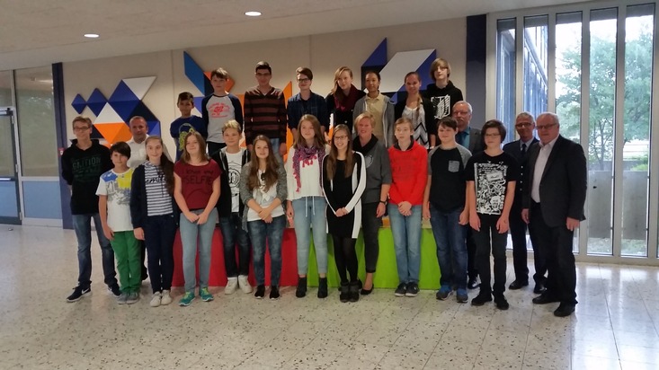 Schülerinnen und Schüler der IGS Gartenstadt erhielten heute, 22. September 2015, ihre Teilnahmeurkunden für die Ausbildung als Sicherheitsberaterin und Sicherheitsberater für Schülerinnen und Schüler (SfSch). Bürgermeister van Vliet und Polizeidirektor Harald Brock zeichnen die Schülerinnen und Schüler in der Schulaula für ihr Ehrenamt aus und überreichten die Urkunden.