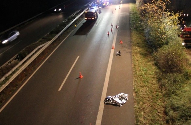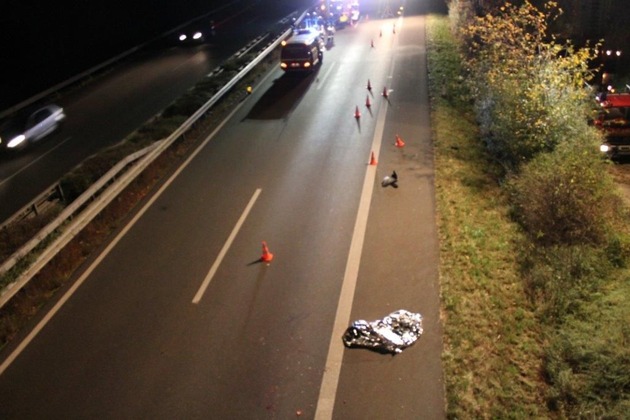Am Sonntag, dem 15.11.2015, um 19:32 Uhr wurde auf der B9 Richtungsfahrbahn Ludwigshafen zwischen der AS Rehhütte/Schifferstadt und AS Limburgerhof/Neuhofen eine bisher unbekannte Frau von dem Pkw eines 36jährigen aus Ludwigshafen und von dem nachfolgenden Pkw einer 43jährigen aus Limburgerhof erfasst. Nach bisherigen Ermittlungen war die Frau zuvor von einer Überführung der B9 auf die Fahrbahn gesprungen, bevor sie von den beiden Fahrzeugen erfasst wurde. Die Frau verstarb an der Unfallstelle. An den Fahrzeugen entstand Sachschaden in Höhe von 4500.- EUR Der 36jährige Ludwigshafener entfernte sich vor Eintreffen der Polizei von der Unfallstelle konnte aber an seiner Wohnanschrift angetroffen werden. Da er unter Einfluss Betäubungsmitteln stand wurde ihm eine Blutprobe entnommen und der Führerschein wurde sichergestellt. Die Bundesstraße 9 war während der Unfallaufnahme und der Bergungsarbeiten ab Anschlussstelle Rehhütte von 20:15 Uhr bis 22:45 Uhr voll gesperrt. Die Feuerwehren Neuhofen und Limburgerhof waren mit 35 Mann im Einsatz.