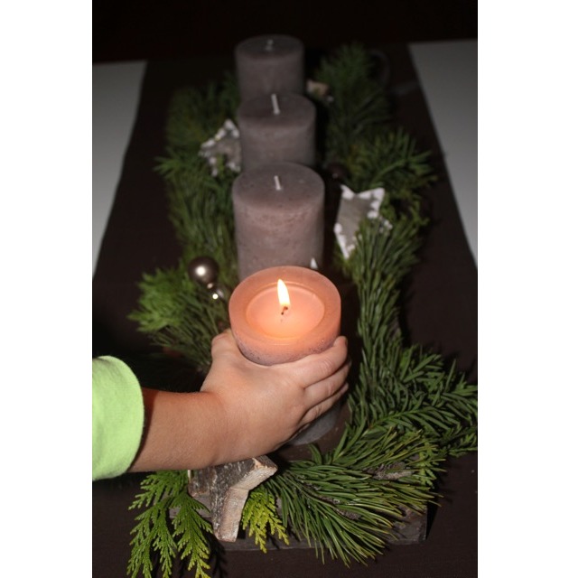 Kerzen immer von "hinten nach vorne" entzünden und entgegengesetzt, also von "vorne nach hinten" löschen. Nie über die Flamme hinweggreifen