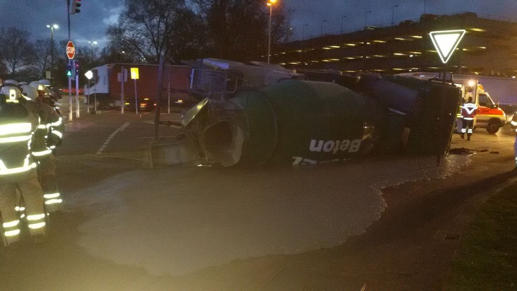 Am Mittwoch, den 13.01.2016, gegen 17:00 Uhr, kam es im Bereich der Brunckstraße zu einem Verkehrsunfall. Beim Abbiegevorgang nach links von der Brunckstraße auf die Ammoniakstraße in Fahrtrichtung Tor 11 der BASF kippte aus bislang ungeklärter Ursache ein Betonmischer um. Hierbei traten insgesamt ca. 4 Kubikmeter flüssige Betonmasse aus. Diese ergoss sich hierbei über die Abbiegerspur. Zu größeren Verkehrsbeeinträchtigungen kam es nicht. Bei dem Verkehrsunfall wurden sowohl der 40-jährige Fahrer als auch der 56-jährige Beifahrer leicht verletzt. Der Beifahrer wurde zur weiteren medizinischen Behandlung in die Berufsgenossenschaftliche Unfallklinik verbracht. Die Bergungs- sowie Säuberungsmaßnahmen seitens der Berufsfeuerwehr Ludwigshafen sowie der Werksfeuerwehr der BASF dauern zur Stunde noch an. Die Schadenssumme dürfte sich auf ca. 15.000 EUR belaufen.