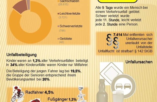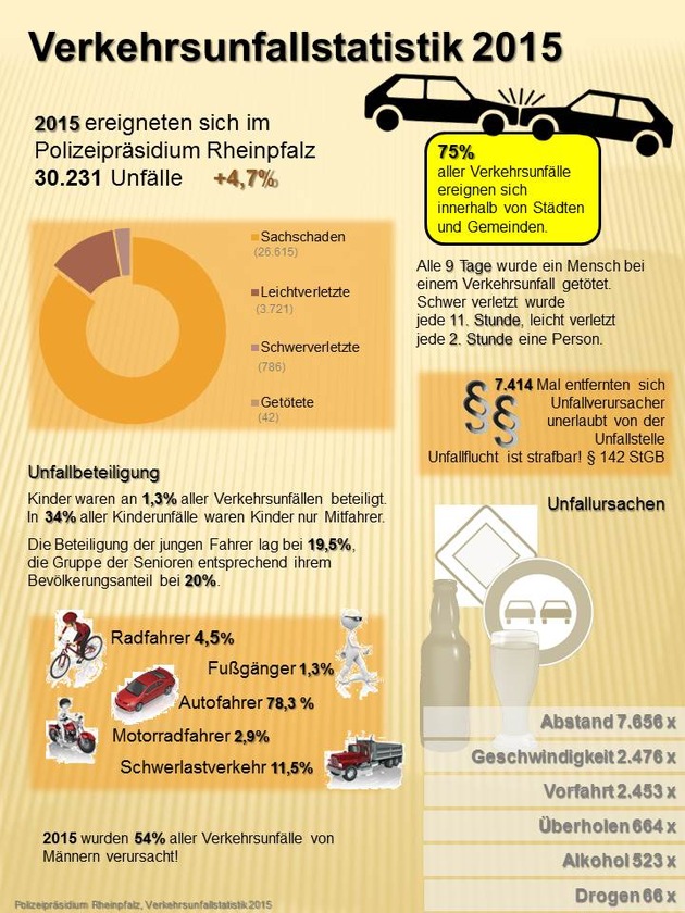 Im vergangenen Jahr ereigneten sich im Bereich des Polizeipräsidiums Rheinpfalz 30.231 Verkehrsunfälle. Dies stellt gegenüber dem Vorjahr eine Steigerung um 4,7 % dar. Diese Entwicklung entspricht fast dem Landestrend. Hierbei wurden 785 Personen schwer- und 3.721 leichtverletzt. Leider müssen wir in diesem Jahr 42 Verkehrsunfalltote beklagen. Hauptunfallursache für die Schwerverletzten und Getöteten waren Geschwindigkeitsverstöße. 2015 kam es zu 7.414 Verkehrsunfallfluchten. Dies stellt gegenüber dem Vorjahr eine Steigerung von 4% oder 279 Unfällen dar. Trotz dieser Steigerung konnte in 3.288 Fällen (44%) der Verursacher ermittelt werden. Leicht angestiegen gegenüber dem Vorjahr sind die Verkehrsunfälle mit Kindern. Mit 395 Verkehrsunfällen handelt es sich jedoch um die zweitniedrigste Zahl seit 2009. Rechnet man die größeren Städte zusammen, dann geschehen dort mehr als die Hälfte der "Kinderunfälle". Bei jedem 3. Unfall wird ein Kind als Mitfahrer verletzt. Bei keiner anderen Bevölkerungsgruppe ist die Wahrscheinlichkeit so hoch, bei einem Verkehrsunfall verletzt zu werden. Die Jugendverkehrsschule sowie die Polizeipuppenbühne unseres Präsidiums bilden die beiden Hauptsäulen unserer Kinderunfallprävention. Durch deren Maßnahmen konnten 11.690 Kinder im vergangen Jahr erreicht werden. Wiederum angestiegen sind die Verkehrsunfälle mit Seniorenbeteiligung. Die Zunahme ist hauptsächlich auf die Altersgruppe 75 Jahre und älter zurückzuführen. Mit der Kampagne "WIR SIND MOBIL" macht das Polizeipräsidium für diese Gruppe ein Präventionsangebot. Bei Verkehrsunfällen unter Alkohol- und/oder Drogeneinwirkung musste 2015 ein leichter Anstieg festgestellt werden. Hauptunfallursache bei allen Verkehrsunfällen ist ein zu geringer Sicherheitsabstand, gefolgt von Verstößen gegen die Geschwindigkeitsregeln und Vorfahrt.