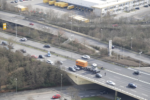 Am Freitagmittag gegen 12:30 Uhr kam es auf der Hochstraße Süd (B 37) Fahrtrichtung Ludwigshafen nach Bad Dürkheim, Höhe Ausfahrt Bruchwiesenstraße, zu einem Verkehrsunfall zwischen einem Lkw und einem Pkw. Verletzt wurde bei dem Unfall keiner. Da zwei Fahrstreifen teilweise blockiert waren, kam es zu Verkehrsbehinderungen. Es entstand Sachschaden. Von einem zufällig vorbeifliegenden Polizeihubschrauber wurden Bilder von der Unfallstelle aus der Luft gefertigt. Gegen 13:15 Uhr war die Unfallaufnahme beendet und die Verkehrsbehinderungen lösten sich auf.