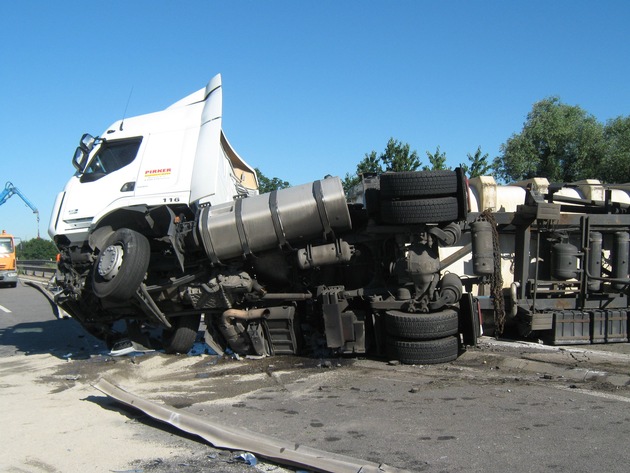 Unfallhergang: Aus bislang unbekannter Ursache kam der 55 Jahre alte Fahrer des Silozuges, der die A 650 in Richtung Bad Dürkheim befuhr, zunächst nach rechts von der Fahrbahn ab. Anschließend übersteuerte er offensichtlich sein Fahrzeug, das im weiteren Verlauf die Mittelschutzplanke durchbrach und umkippte. Dabei wurde der Fahrer leicht verletzt. Der entstandene Sachschaden beträgt ca. 200 000.- EUR.