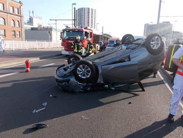 Zwei Verkehrsteilnehmer befuhren mit ihren Pkw hintereinander die Yorckstraße in Fahrtrichtung Mannheim. Bei Auffahrt auf die Konrad-Adenauer-Brücke musste Ersterer, ein 22-jähriger Fahrzeugführer, verkehrsbedingt am Einmündungsbereich abbremsen. Aufgrund von Unachtsamkeit fuhr die dahinter befindliche 20-jährige PKW-Fahrerin auf das haltende Fahrzeug auf. Die Fahrzeugführerin versuchte noch durch ein ruckartiges Lenkmanöver den Zusammenstoß zu verhindern. Wohl aufgrund dieser Tatsache und dass es doch zu einem Zusammenstoß kam, stellte sich der Pkw auf, überschlug sich und blieb auf der linken Fahrspur der B37 auf dem Dach liegen. Noch vor Eintreffen der Rettungskräfte und der Polizei konnte sich die Frau selbstständig befreien und blieb nach eigenen Angaben unverletzt. Ebenso unverletzt blieb der andere Fahrzeugführer. An beiden Fahrzeugen entstand ein Gesamtschaden von ca. 35.000.-- Euro. Aufgrund der Unfallaufnahme musste die beiden durchgängigen Fahrbahnen der B37, sowie die Auffahrt (L523) kurzzeitig vollständig gesperrt werden, weshalb es zu Verkehrsbeeinträchtigungen kam.