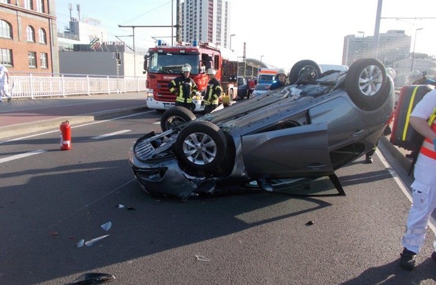 Zwei Verkehrsteilnehmer befuhren mit ihren Pkw hintereinander die Yorckstraße in Fahrtrichtung Mannheim. Bei Auffahrt auf die Konrad-Adenauer-Brücke musste Ersterer, ein 22-jähriger Fahrzeugführer, verkehrsbedingt am Einmündungsbereich abbremsen. Aufgrund von Unachtsamkeit fuhr die dahinter befindliche 20-jährige PKW-Fahrerin auf das haltende Fahrzeug auf. Die Fahrzeugführerin versuchte noch durch ein ruckartiges Lenkmanöver den Zusammenstoß zu verhindern. Wohl aufgrund dieser Tatsache und dass es doch zu einem Zusammenstoß kam, stellte sich der Pkw auf, überschlug sich und blieb auf der linken Fahrspur der B37 auf dem Dach liegen. Noch vor Eintreffen der Rettungskräfte und der Polizei konnte sich die Frau selbstständig befreien und blieb nach eigenen Angaben unverletzt. Ebenso unverletzt blieb der andere Fahrzeugführer. An beiden Fahrzeugen entstand ein Gesamtschaden von ca. 35.000.-- Euro. Aufgrund der Unfallaufnahme musste die beiden durchgängigen Fahrbahnen der B37, sowie die Auffahrt (L523) kurzzeitig vollständig gesperrt werden, weshalb es zu Verkehrsbeeinträchtigungen kam.