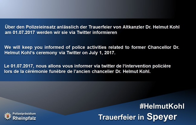 Anlässlich der Trauerfeier von Altkanzler Dr. Helmut Kohl am 1. Juli 2017 in Speyer werden wir den Polizeieinsatz über Twitter https://twitter.com/PP_Rheinpfalz begleiten.