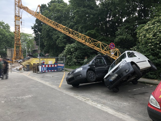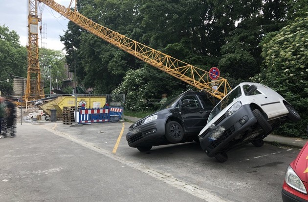 Während Abbauarbeiten eines Baukrans in der Rottstraße, löste sich heute (23.05.2018) gegen 8.30 Uhr ein Bremsscharnier am Kran, wodurch sich ein Seitenarm des Baukrans abkoppelte und auf zwei geparkte PKW fiel. Die PKW wurden durch die Wucht des Aufpralls erheblich beschädigt. Bei dem Unfall wurden keine Personen verletzt. Die Höhe des Sachschadens wird derzeit noch ermittelt.
